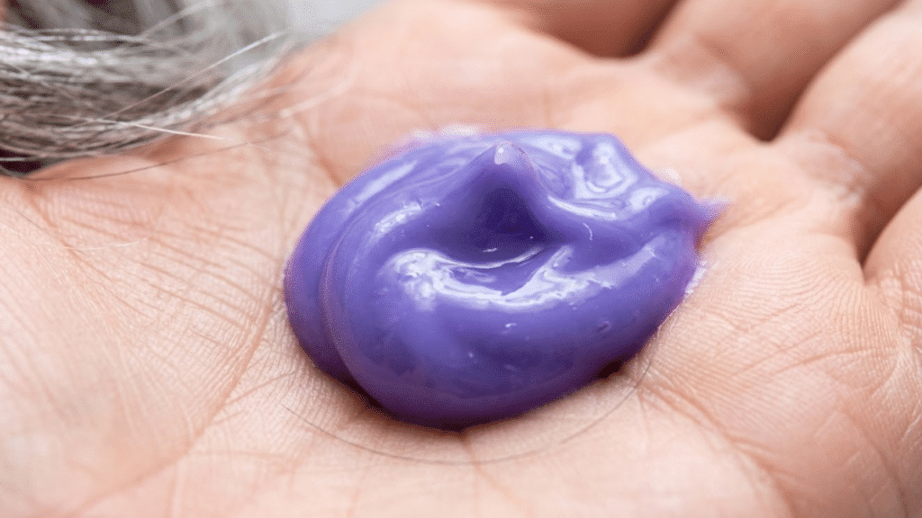 Condicionador violeta cremoso para cabelos grisalhos na palma da mão
