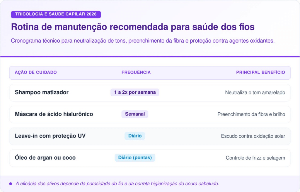 Além da cor, a hidratação deve ser profunda e semanal. Máscaras ricas em ácido hialurônico e óleos vegetais, como o de argan, são essenciais para selar as cutículas e combater o toque áspero. Veja como aplicar isso na prática através da rotina de manutenção recomendada por especialistas em tricologia: