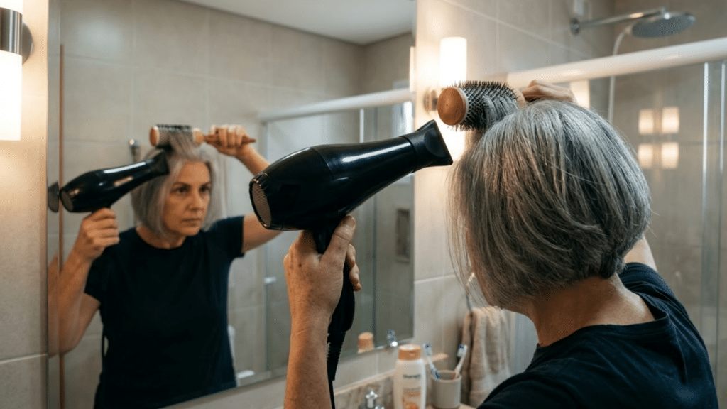Mulher finalizando o volume de um corte ‘Short Bob’ com secador em frente ao espelho