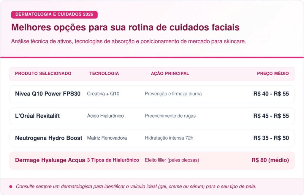 A tecnologia cosmética no Brasil alcançou um patamar de alta eficiência com custos reduzidos em 2026. Hoje, é perfeitamente possível encontrar hidratantes faciais que entregam resultados profissionais na suavização de vincos e marcas de idade, utilizando ativos que antes eram restritos a produtos de luxo.