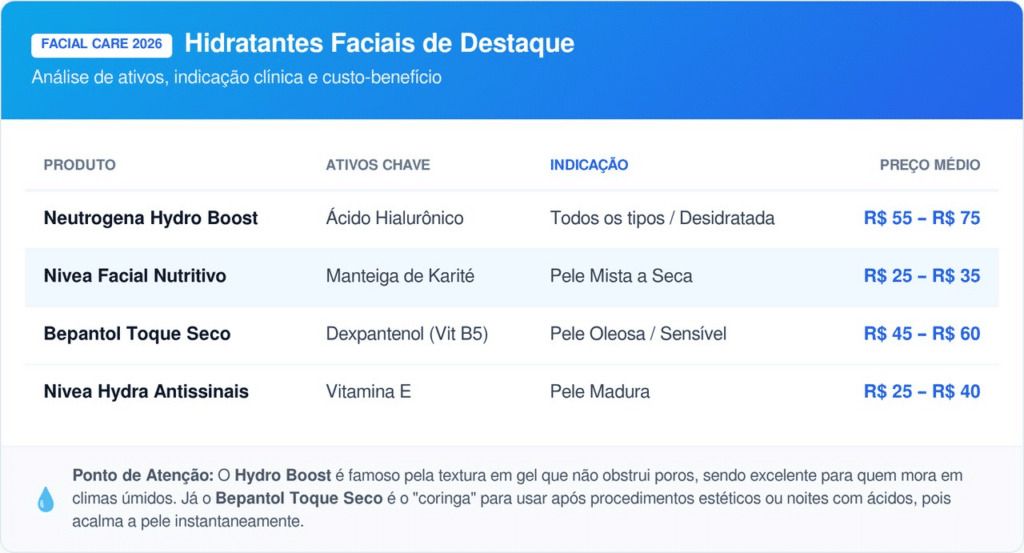 Para o rosto, opções como o Neutrogena Hydro Boost e o Nivea Nutritivo são os favoritos de quem busca acabamento premium. Eles oferecem uma absorção instantânea que prepara a pele para a maquiagem, evitando o acúmulo de oleosidade e garantindo hidratação por até 72 horas seguidas.