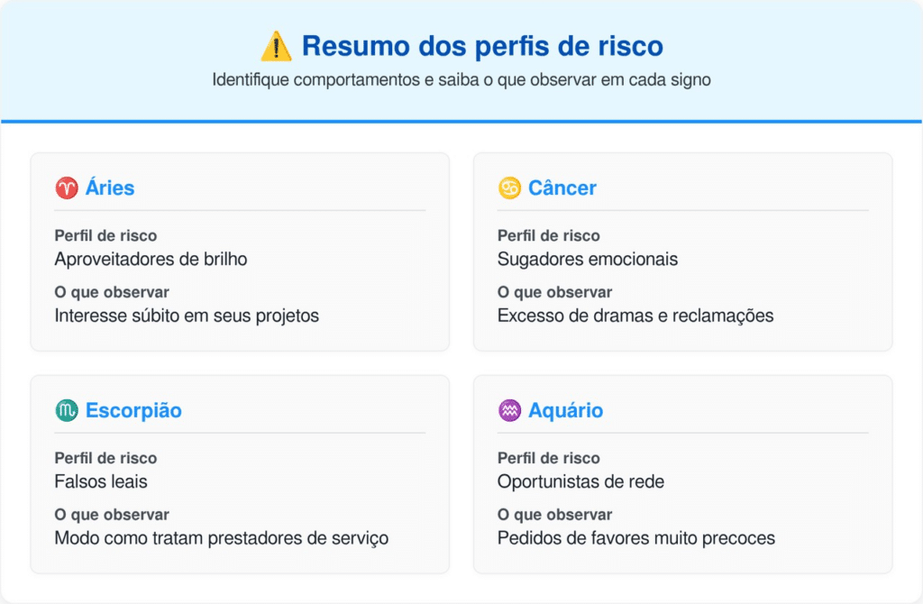 O planejamento estratégico nas relações evita que sua influência seja usada por terceiros mal-intencionados. A tabela abaixo resume os perfis de risco para cada um dos quatro signos mencionados nestas previsões astrológicas:
