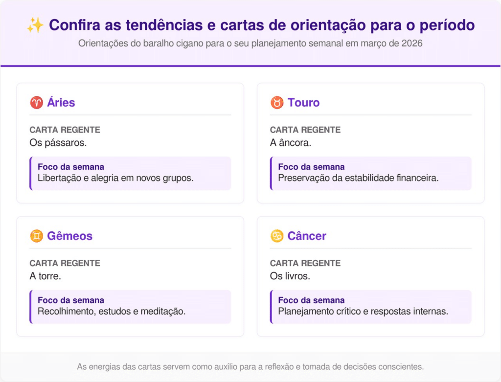 Sob a regência de Marte, a exposição excessiva pode gerar conflitos desnecessários para quem possui sensibilidade aguçada. Gêmeos deve buscar a torre do silêncio para evitar fofocas, enquanto Câncer utiliza o recolhimento para ler os “livros” da própria alma e redefinir objetivos.