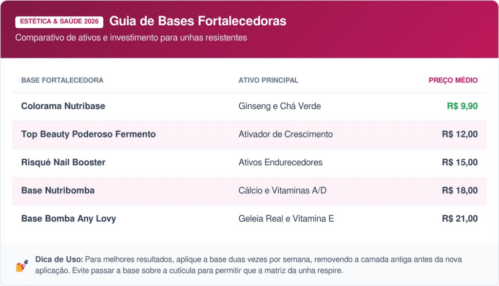 As bases fortalecedoras baratinhas são a solução ideal para quem sofre com unhas quebradiças e deseja acelerar o crescimento de forma saudável. Com investimentos entre R$ 10 e R$ 25, é possível nutrir a queratina natural e evitar a descamação constante.