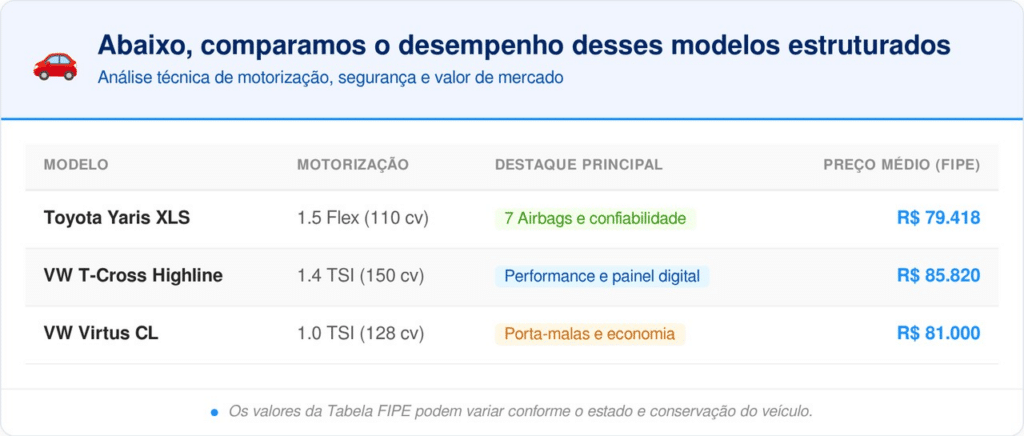Para os entusiastas de SUVs que buscam confiabilidade mecânica, o Hyundai ix35 2019 (Launch Edition) continua imbatível. Tabelado em R$ 89.749, ele oferece o valente motor 2.0 de 167 cv. Por outro lado, quem prefere a eficiência alemã encontra no Volkswagen Virtus Comfortline 2021 (aprox. R$ 81.000) a plataforma MQB, famosa pela nota máxima em segurança e pelo torque vigoroso do motor 1.0 TSI.