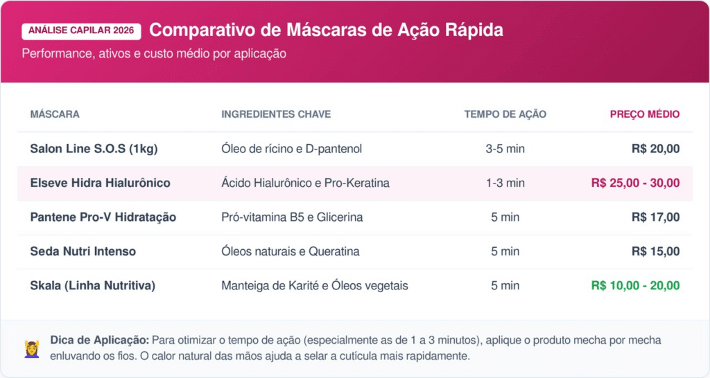 Marcas como Salon Line e Pantene oferecem opções que custam entre R$ 17 e R$ 25 nas principais farmácias e supermercados. Esses produtos são desenvolvidos com alta concentração de vitaminas que repõem os lipídios essenciais para a saúde dos fios.