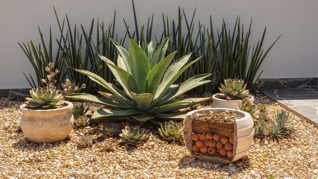 Agrupar plantas com necessidades de rega e sol parecidas cria um microclima favorável e facilita a manutenção. Um pequeno canteiro com Agaves, Suculentas e Onze-Horas funciona muito bem, pois todas compartilham a preferência por solos arenosos e exposição direta à luz solar. Essa combinação traz diferentes texturas para o quintal.