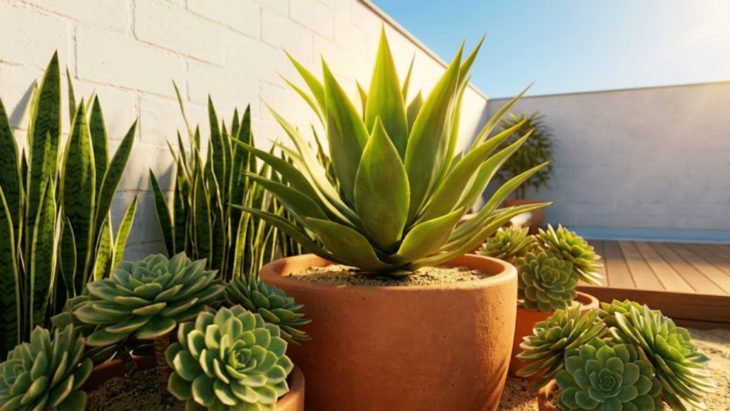 A Espada-de-São-Jorge e as suculentas, como a Rosa-de-Pedra, são escolhas clássicas pela baixa necessidade de rega e alta tolerância ao calor. Enquanto a Espada-de-São-Jorge cresce em tufos verticais que economizam espaço lateral, as suculentas formam rosetas compactas que se adaptam a vasos pequenos de barro ou cimento.