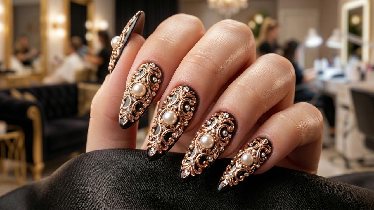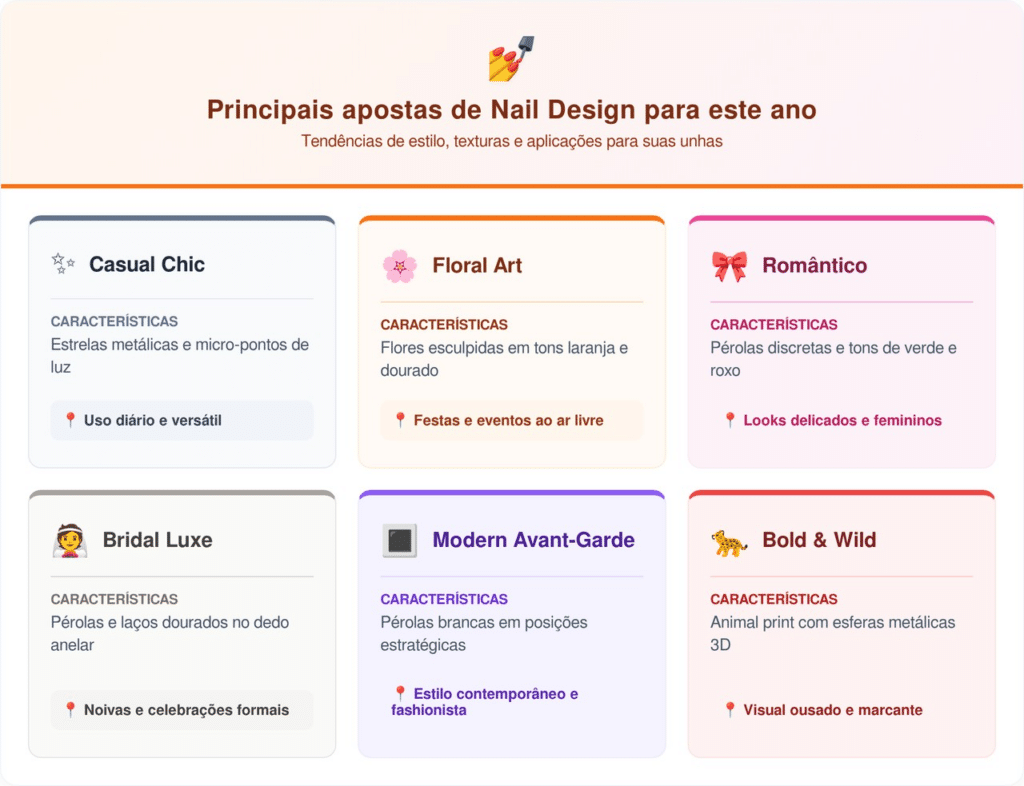 Diferente das esmaltações planas tradicionais, a aplicação de elementos em relevo, como pedrarias, micropérolas, cristais e adesivos volumosos, confere uma dimensão tátil única. Essa tendência permite desde um visual minimalista, com pontos focais em uma única unha, até designs maximalistas que contornam as cutículas com brilho e sofisticação.