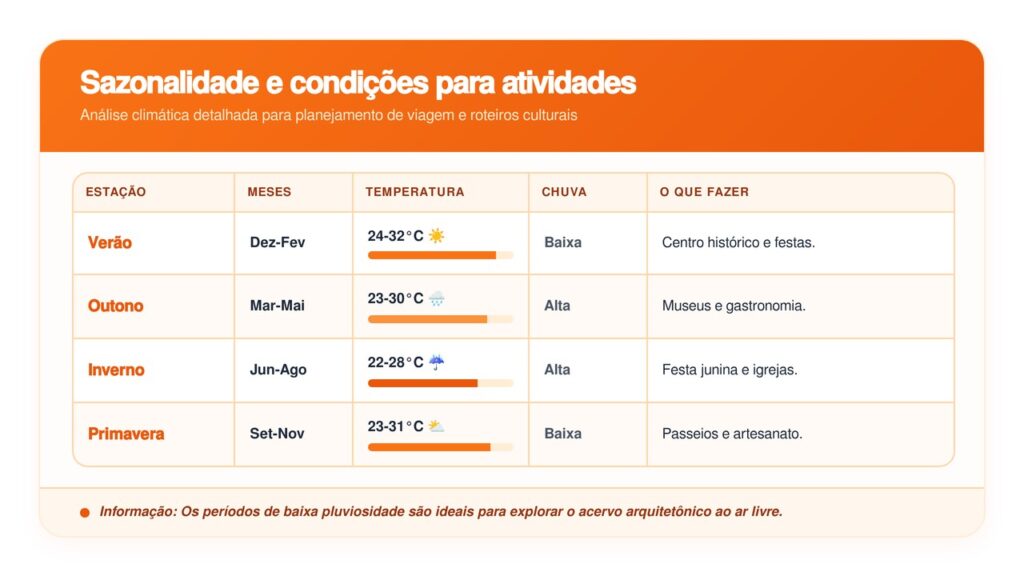 O clima é tropical, quente o ano inteiro, com chuvas concentradas no outono e inverno. A melhor época para passeios ao ar livre vai de setembro a fevereiro.