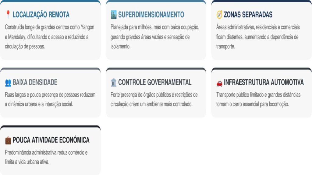 Além da localização, diversos elementos tornam a vida cotidiana menos atrativa. O planejamento urbano e as restrições impostas pelo governo contribuem para a sensação de isolamento. Entre os principais pontos que dificultam a permanência na cidade estão: