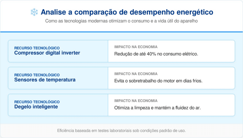 A eficiência energética é o ponto onde a diferença para as geladeiras tradicionais se torna mais evidente no bolso. Equipados com compressores Inverter, esses modelos evitam os picos de consumo, operando de forma contínua e silenciosa conforme a demanda térmica.