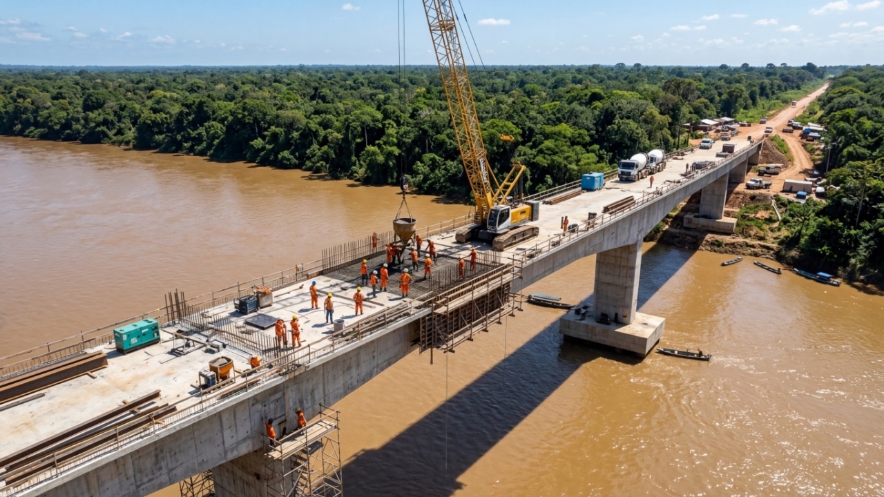 Esse estágio da ponte sobre o Rio Tarauacá é relevante porque a concretagem do tabuleiro representa um marco visível na evolução da obra. Em engenharia rodoviária, esse tipo de avanço sinaliza a consolidação da estrutura e aproxima a entrega das próximas etapas operacionais.