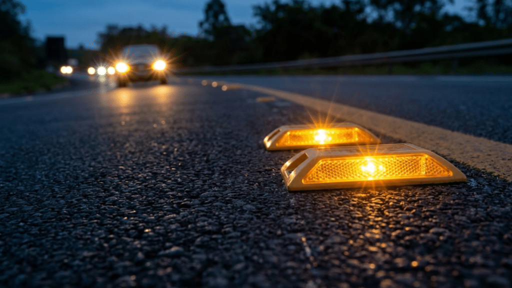 Tachas refletivas brilhando no asfalto novo para garantir segurança noturna
