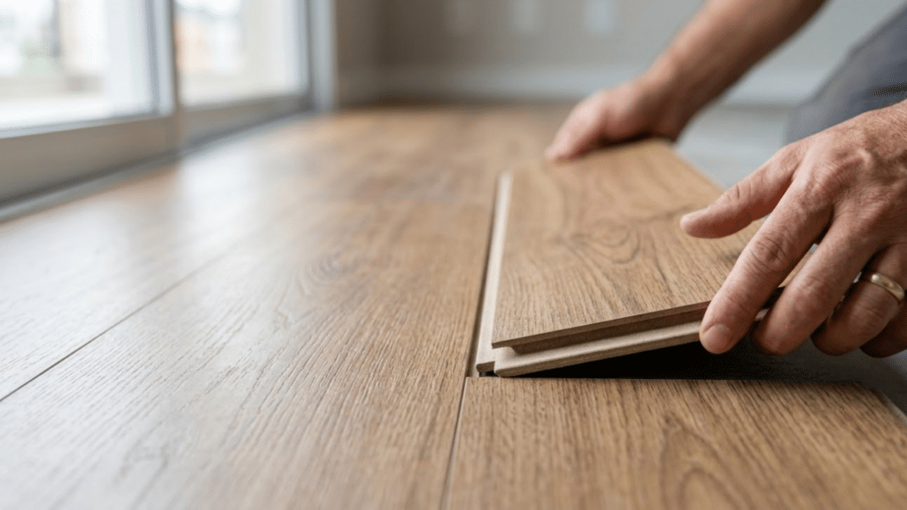 Detalhe técnico do encaixe tipo click de piso laminado moderno