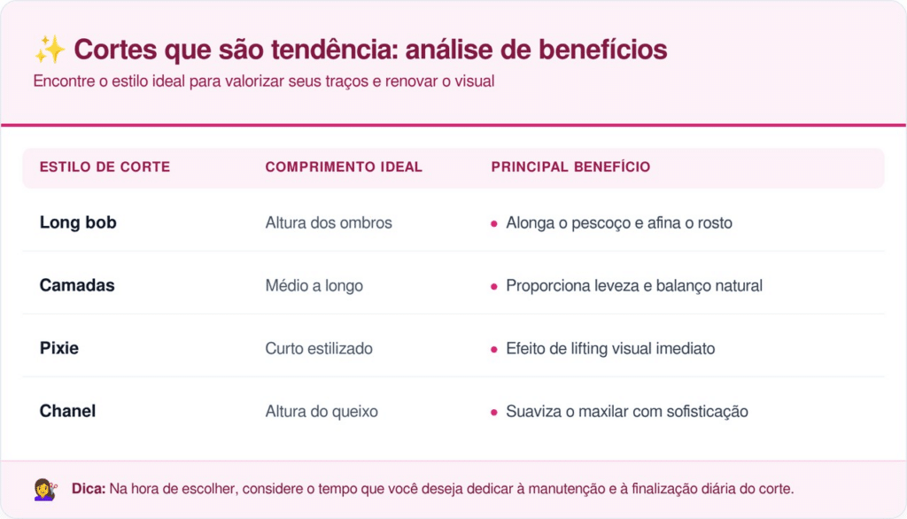 A escolha do estilo ideal deve unir praticidade diária com um efeito visual de rejuvenescimento. Algumas opções se destacam pela versatilidade, permitindo que a pessoa transite entre ambientes formais e momentos de lazer com elegância e facilidade de finalização.
