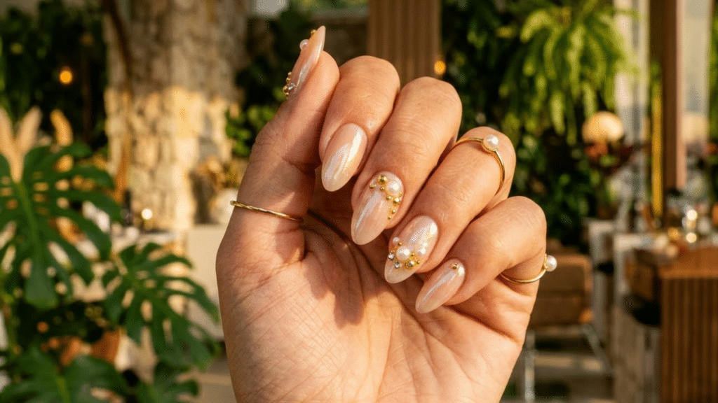 Unhas com aplicações de pérolas e esferas douradas sob luz solar