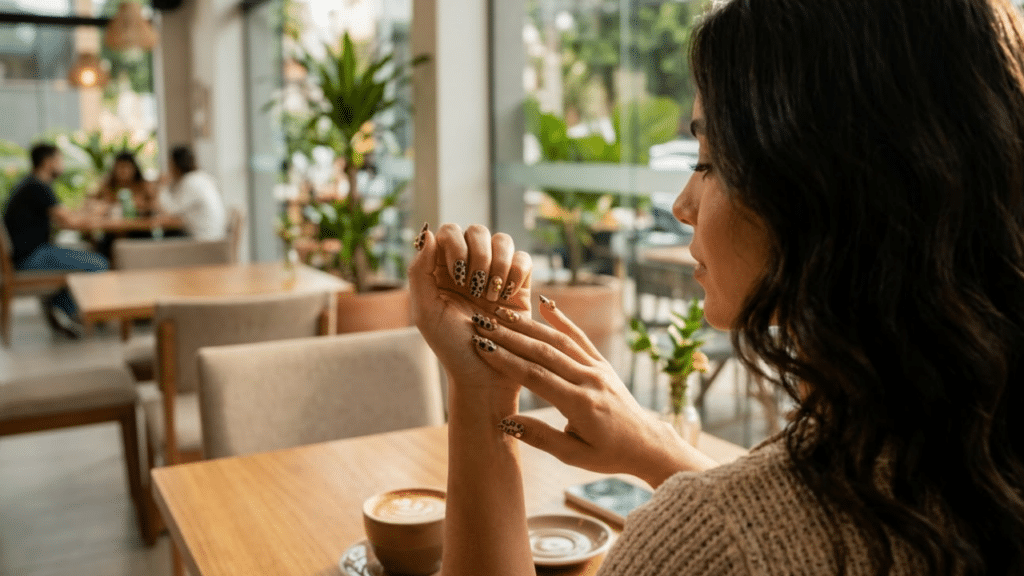 Mulher observa suas unhas decoradas com estampa animal e relevo dourado