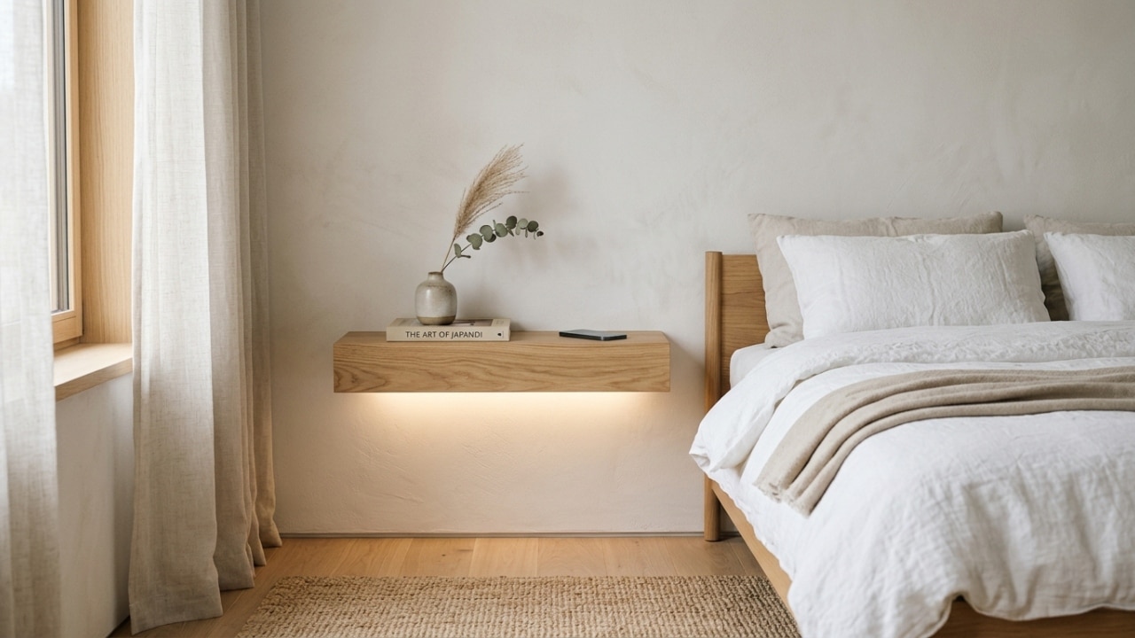 - Estilo Japandi: Mescla de madeira clara e linhas minimalistas sem suportes visíveis.
