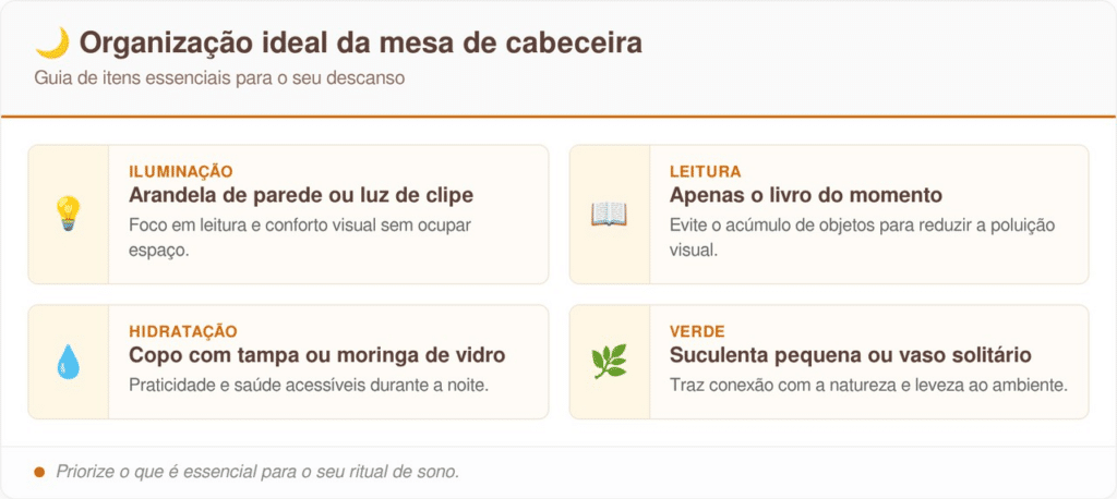 O conceito de “menos é mais” é vital aqui. O excesso de itens transforma a prateleira em um depósito de bagunça, anulando o benefício estético da troca. Designers sugerem uma curadoria rígida, limitando a superfície a no máximo quatro objetos essenciais para o uso noturno.