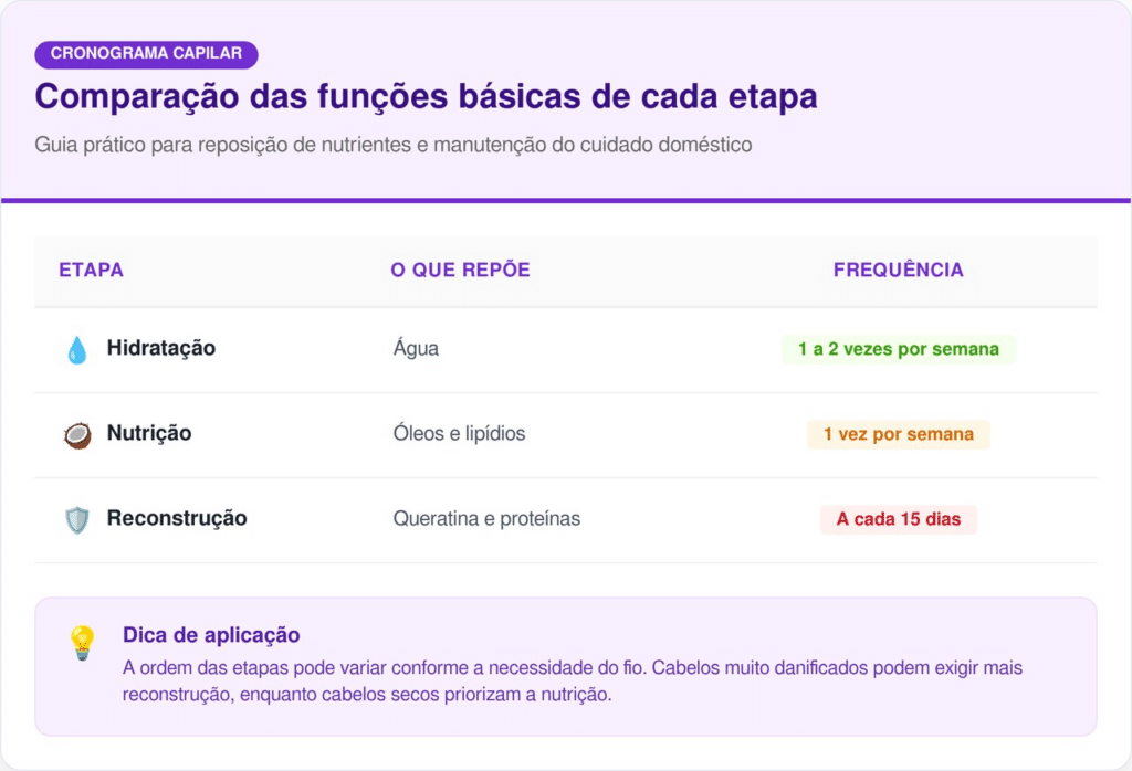 Misturar as etapas sem critério pode sobrecarregar os fios. É importante entender o que cada tratamento repõe para manter o equilíbrio da saúde capilar. Veja a comparação das funções básicas de cada etapa do cuidado doméstico: