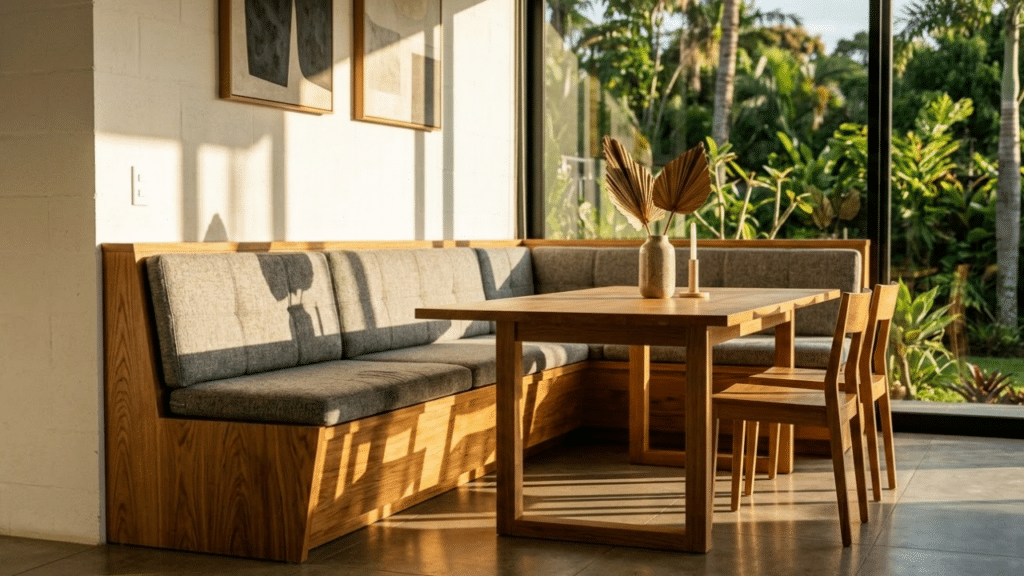 Bancos embutidos otimizam espaço e oferecem visual moderno para salas de jantar