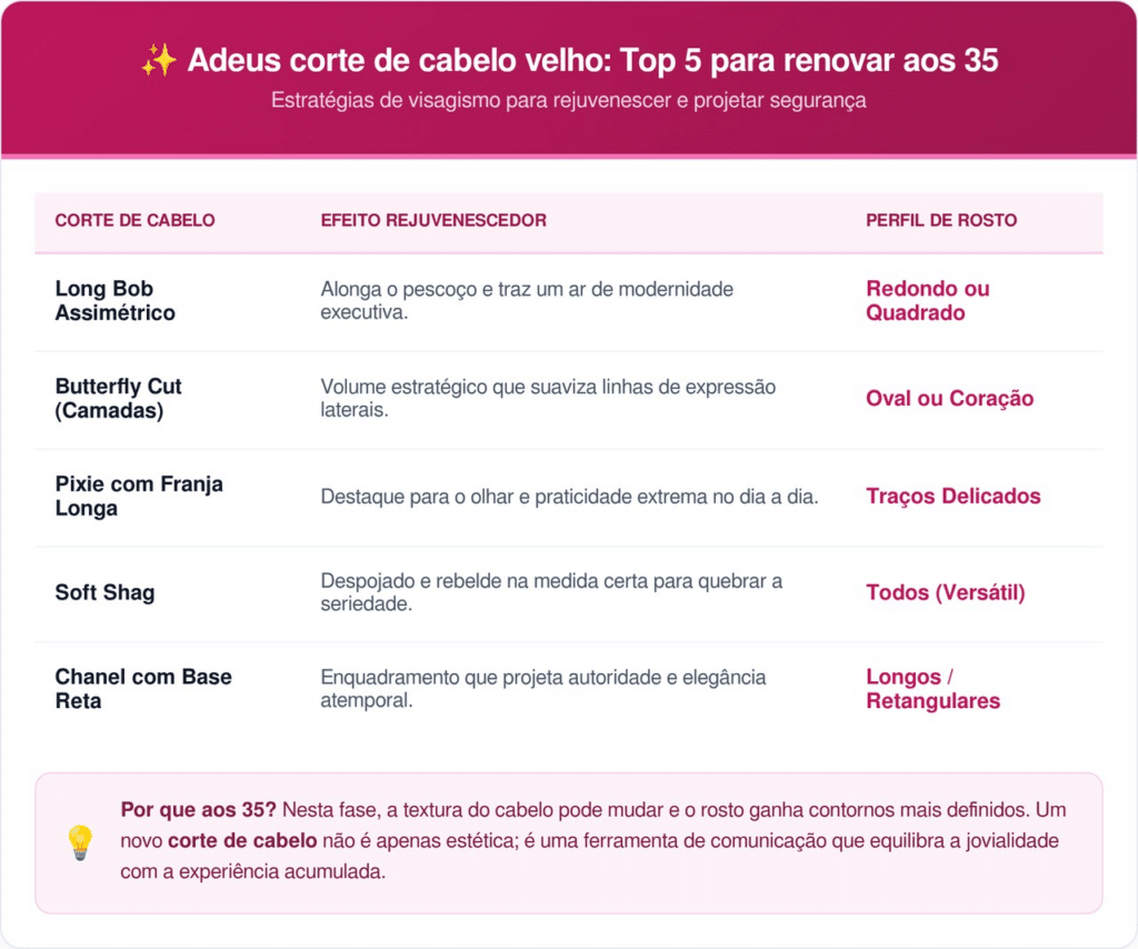 Atualizar o corte de cabelo aos 35 anos suaviza linhas de expressão e projeta segurança. Escolher o modelo ideal gera uma renovação visual imediata, harmonizando os novos traços faciais com modernidade.
