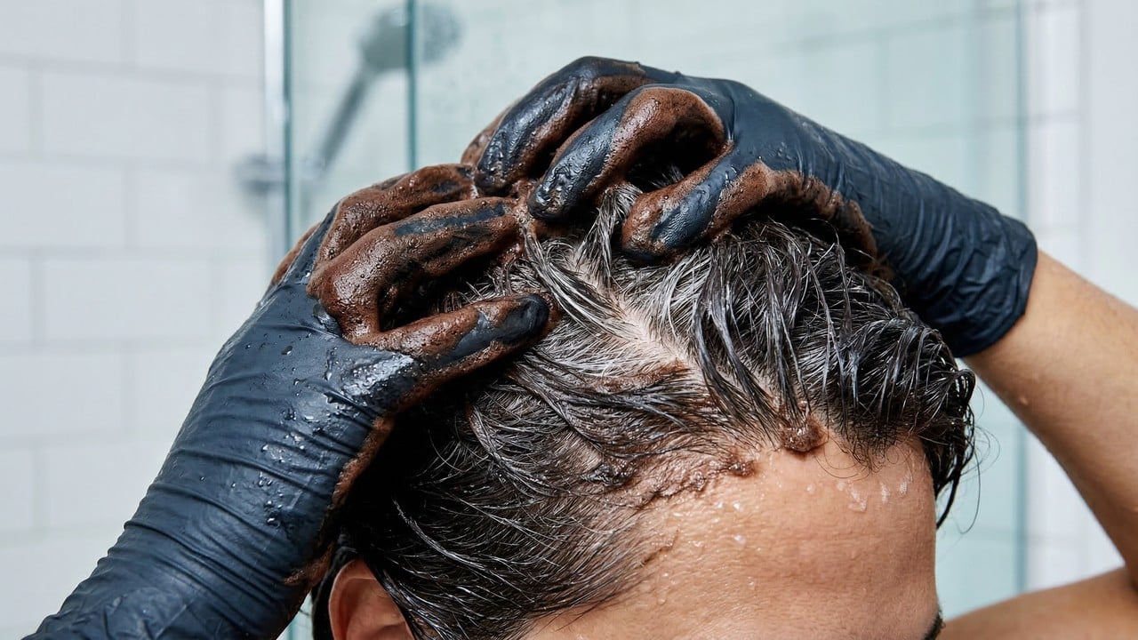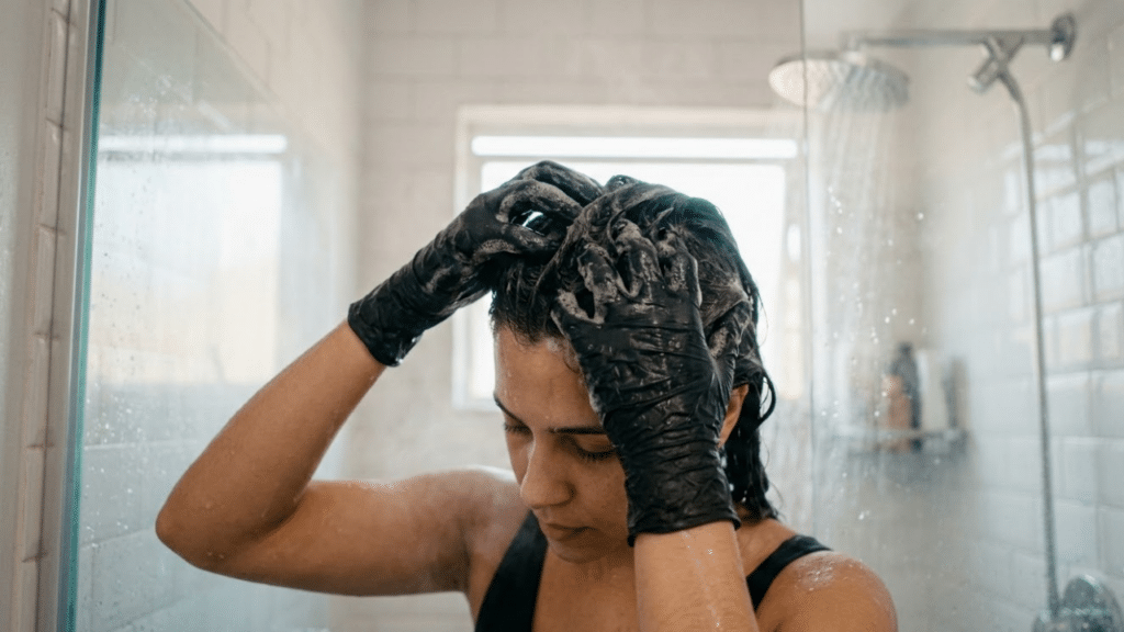 Mãos enluvadas massageando a espuma escura do shampoo no cabelo