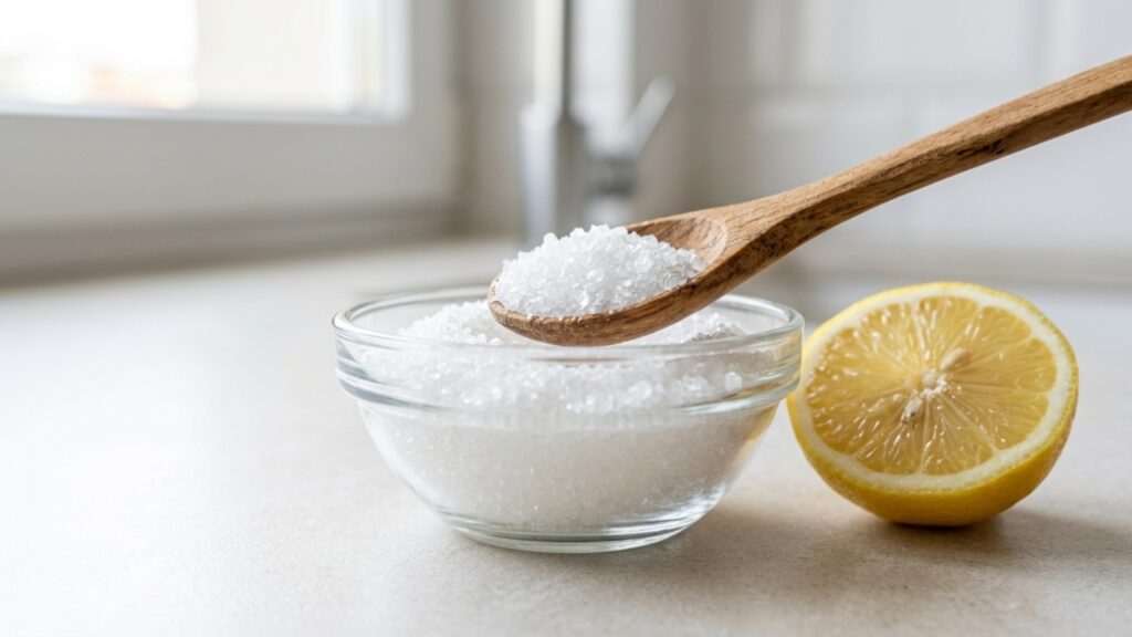 A alternativa recomendada por especialistas é o ácido cítrico em pó, um composto orgânico extraído de frutas que apresenta pH entre 2,2 e 3,0. Essa acidez superior permite que o produto reaja diretamente com o calcário de torneiras, desintegrando a crosta branca sem exalar odores fortes no banheiro.
