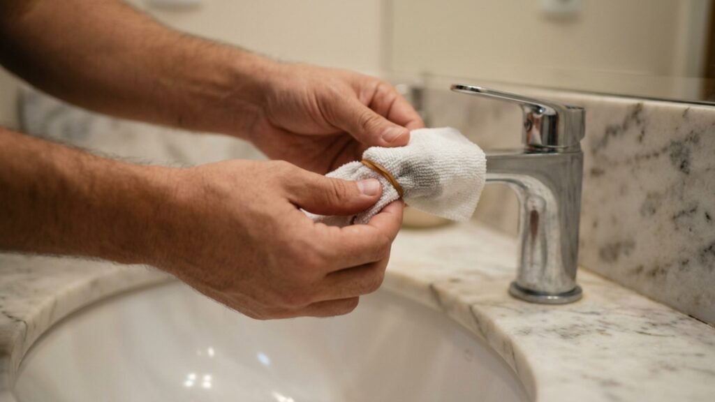 - Envolva a bica da torneira com um pano embebido na mistura por 15 a 30 minutos.