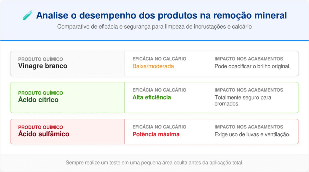 A escolha entre o ácido orgânico e o industrial depende da espessura da camada mineral e do tipo de metal envolvido na limpeza. Para orientar sua escolha, elaboramos um comparativo técnico de eficácia entre os principais agentes químicos utilizados na manutenção residencial em 2026.