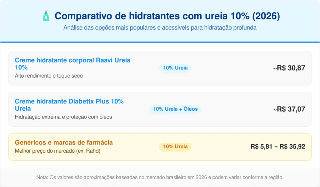 A escolha do produto deve levar em conta o nível de dano na região. Concentrações de 3% a 5% são ideais para manutenção e hidratação diária de peles normais. Já os cremes com ureia a 10% são os mais recomendados por especialistas para tratar pés com rachaduras profundas e pele extremamente grossa.