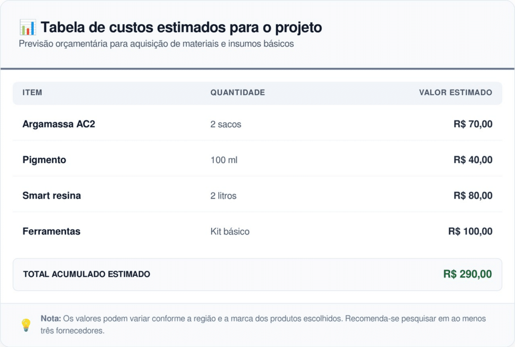 A lista de compras para este projeto é curta e acessível em qualquer loja de materiais de construção no Brasil. O componente principal é a Argamassa AC2, que possui a flexibilidade necessária para evitar rachaduras e garantir a fixação do pigmento.