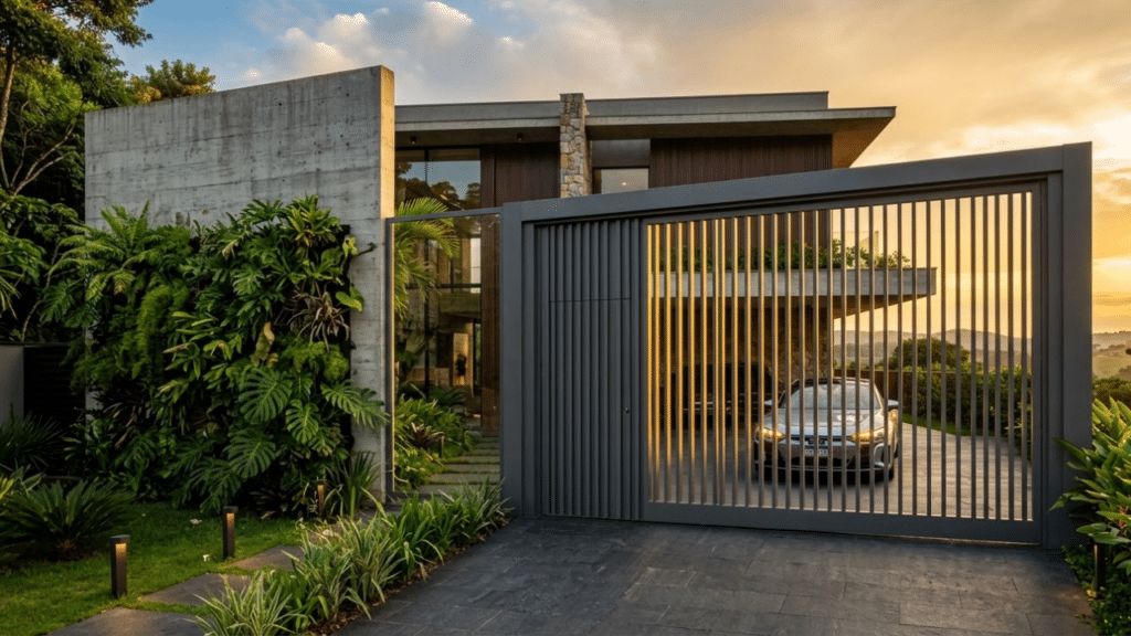 Substituir elementos ultrapassados, como os pesados portões de ferro, é o ponto de partida para quem deseja transformar a estética da residência. A arquitetura contemporânea de 2026 prioriza materiais leves, minimalistas e que oferecem alta segurança sem comprometer o refinamento visual da fachada.