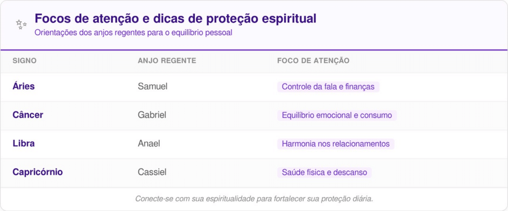 O planejamento dessas pausas é essencial para manter a produtividade a longo prazo. Veja abaixo os principais focos de atenção e as dicas de proteção espiritual para cada um dos signos mencionados na mensagem oficial: