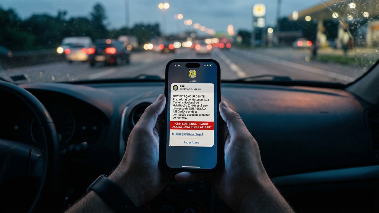 A PRF informou que criminosos estão se passando pela instituição para dar aparência oficial a cobranças e notificações falsas. Em muitos casos, o motorista recebe uma mensagem dizendo que existe multa em aberto, risco de suspensão da CNH ou necessidade de pagamento urgente para evitar bloqueios e penalidades. A corporação publicou alerta nacional sobre essas fraudes e reforçou que esse tipo de abordagem tem sido usado para enganar a população.