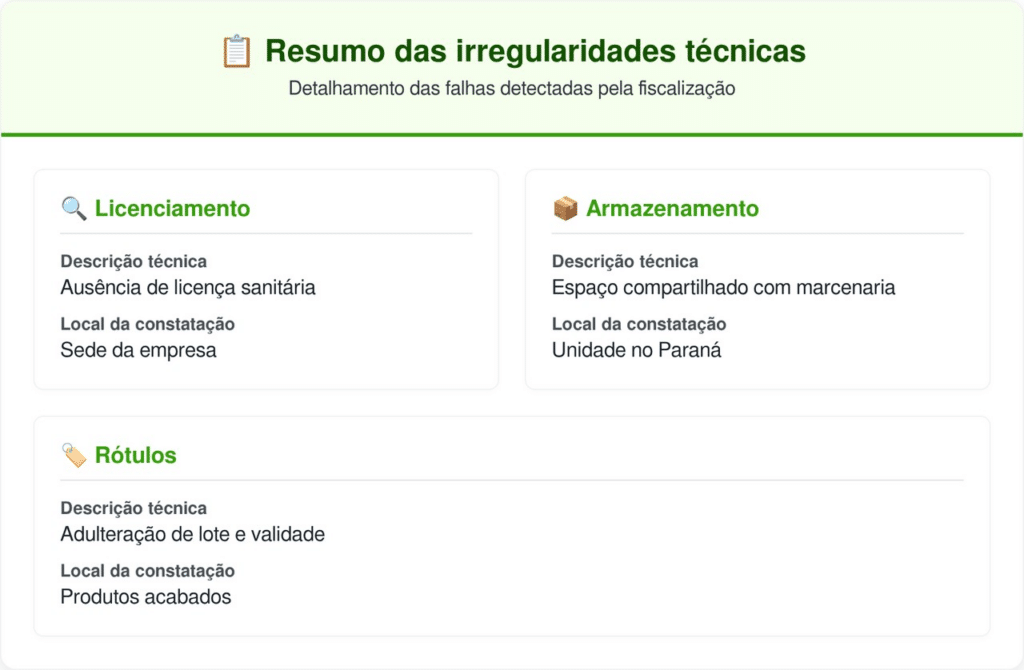 Além da falta de higiene e do ambiente impróprio, a empresa não possuía a licença sanitária obrigatória para operar. Houve também a identificação de fraudes graves nos rótulos, onde informações essenciais como o número do lote e a data de validade dos produtos eram adulteradas.