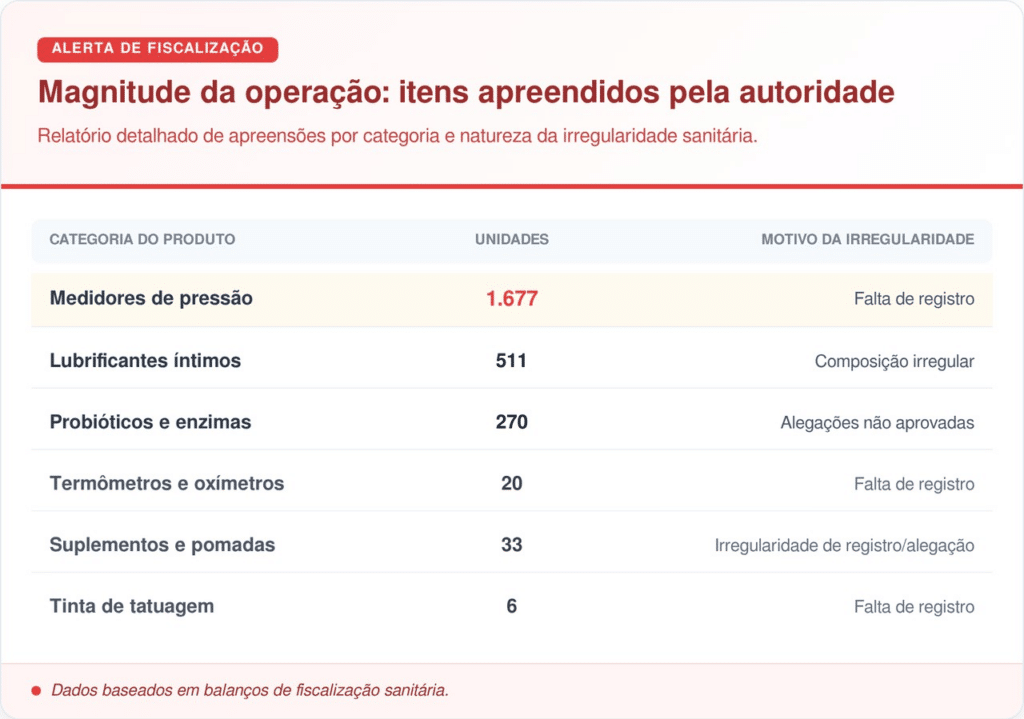 A presença de produtos irregulares no ambiente digital coloca em risco a saúde pública, especialmente no caso de aparelhos de medição descalibrados. Para compreender melhor a magnitude da operação, veja como aplicar isso na prática ao analisar o volume de itens apreendidos pela autoridade: