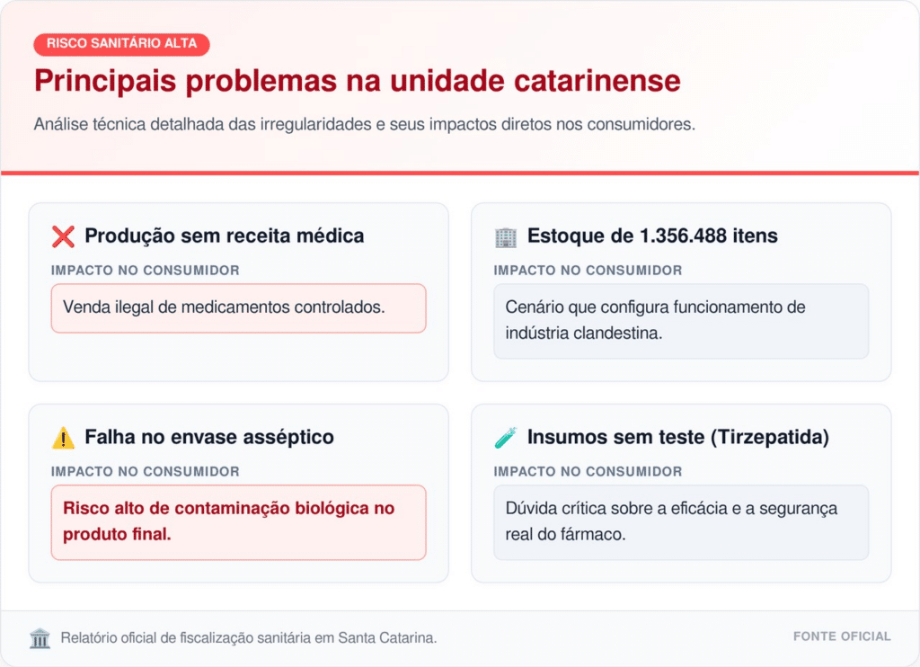 Os fiscais encontraram um estoque massivo de injetáveis à espera de futuros compradores, caracterizando produção em série sem receita. Além disso, foram detectadas falhas críticas na esterilização por envase asséptico, elevando o risco de contaminação por fungos e bactérias para os usuários finais.