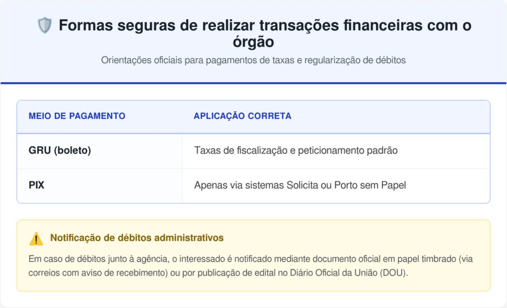 A arrecadação de valores pela agência é feita estritamente por vias administrativas formais, nunca por meio de depósitos em contas de pessoas físicas ou transferências PIX avulsas. O instrumento padrão para quitação de débitos é a Guia de Recolhimento da União (GRU), emitida pelos sistemas oficiais de peticionamento.