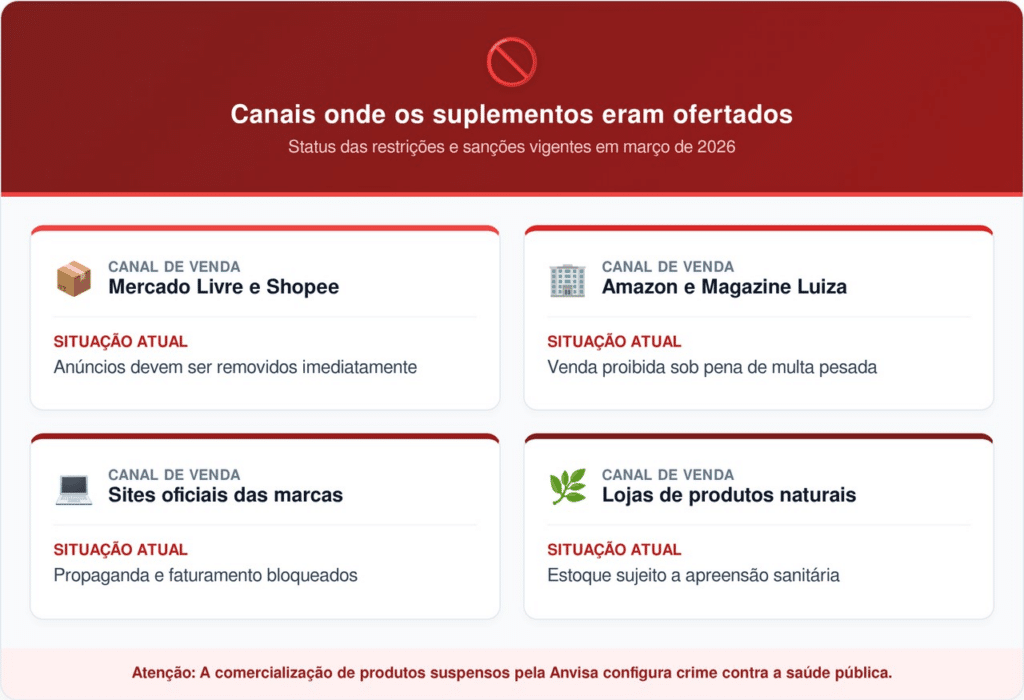 O monitoramento da agência identificou anúncios ativos em diversas plataformas de e-commerce. Analise abaixo os canais onde esses suplementos eram frequentemente ofertados: