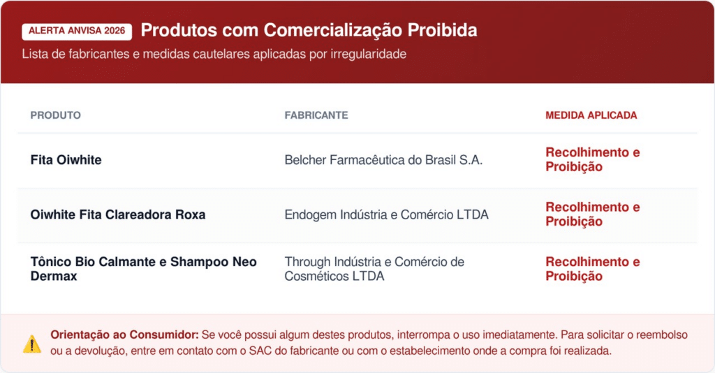 A Resolução 976/2026 cita nominalmente a fita de clareamento Oiwhite e a versão Oiwhite – Fita Clareadora Dental Roxa. O consumidor deve interromper o uso desses itens imediatamente para evitar riscos à saúde bucal não monitorados pela autarquia.