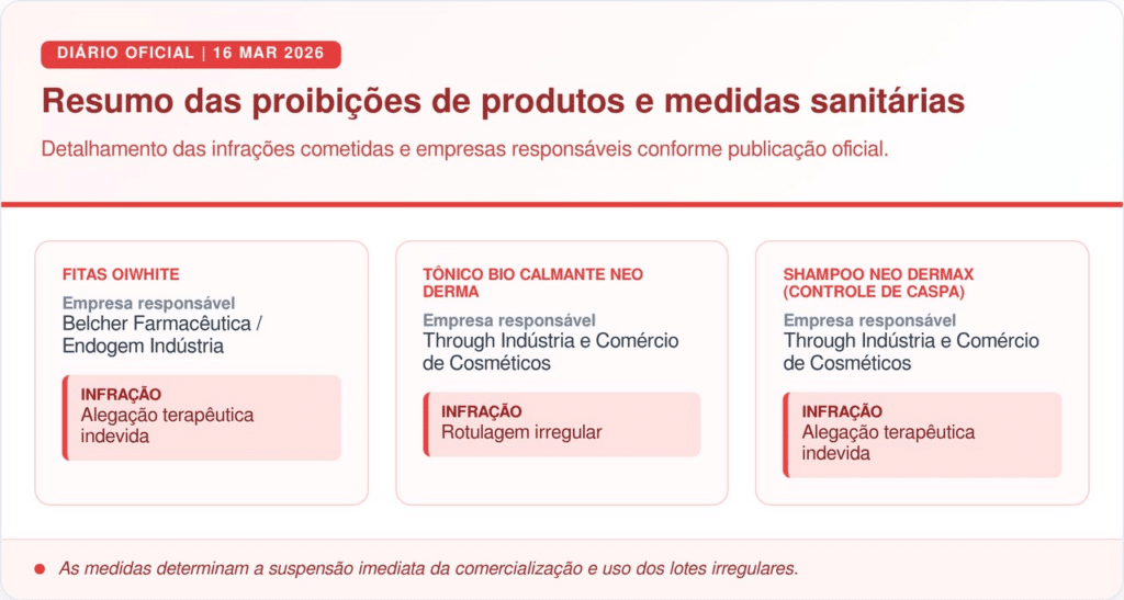 Além dos itens voltados para o sorriso, a fiscalização identificou problemas em cosméticos capilares da empresa Through Indústria e Comércio de Cosméticos LTDA. O tônico Bio Calmante Neo Derma e o shampoo Neo Dermax para Controle de Caspa também prometiam resultados terapêuticos não autorizados em seus rótulos, resultando no recolhimento obrigatório.