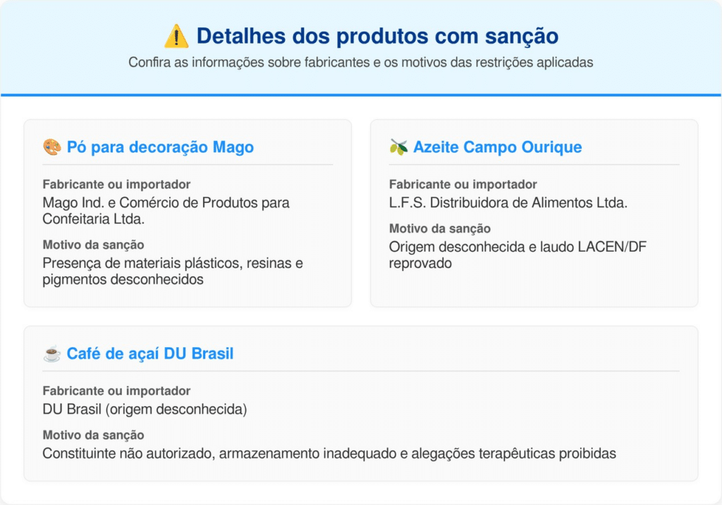 A Anvisa determinou, em 6 de fevereiro de 2026, a suspensão e o recolhimento imediato do pó para decoração de doces da marca Mago. Além do item de confeitaria, um azeite de oliva e um café de açaí também sofreram sanções graves por irregularidades sanitárias e origem desconhecida.