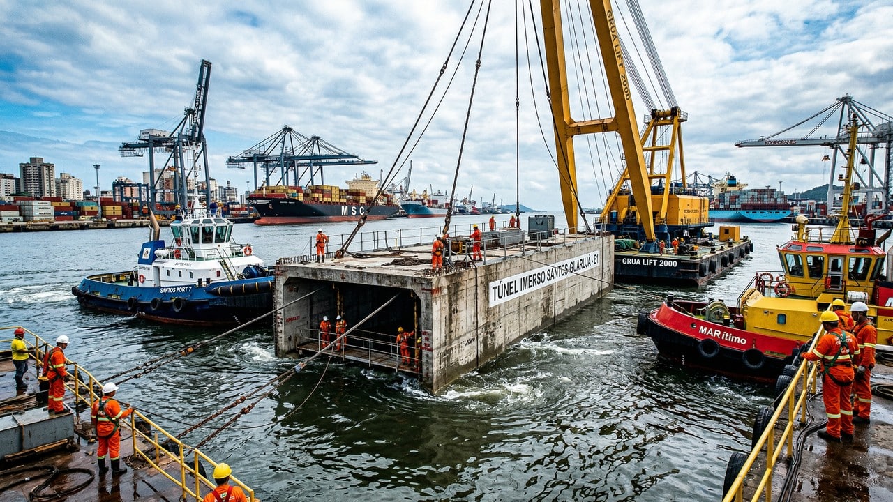 O túnel Santos Guarujá será o primeiro túnel imerso da América Latina, com cerca de 1,5 quilômetro de extensão, incluindo aproximadamente 870 metros assentados no leito do canal. Os módulos de concreto serão pré-moldados em doca seca, flutuados até o local definitivo e afundados com precisão, seguindo padrões usados em túneis europeus.