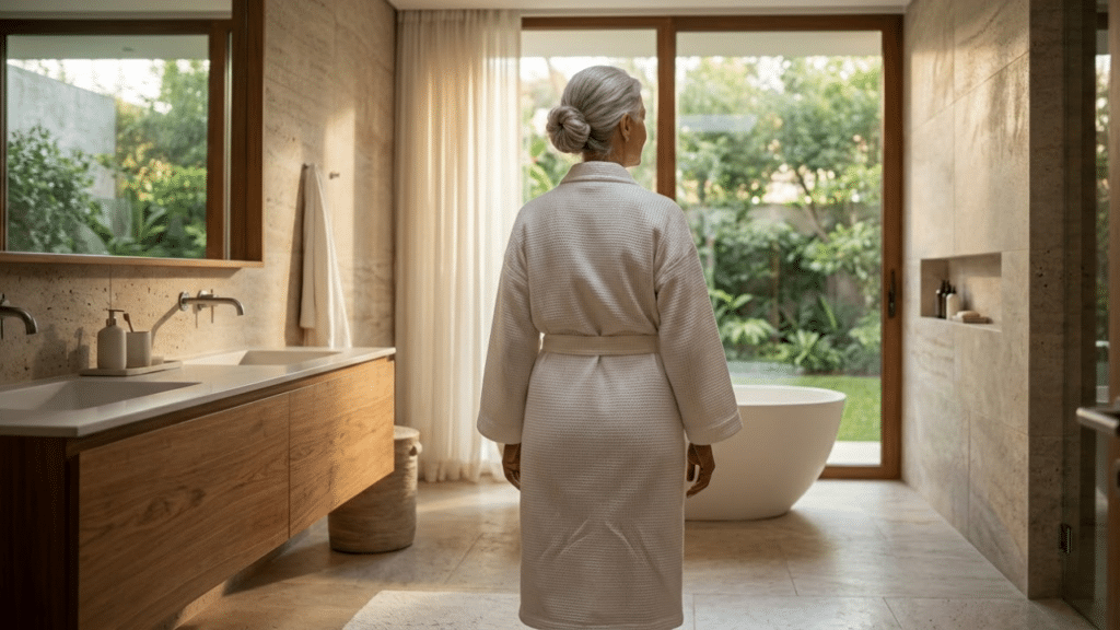 Uma mulher de cabelos grisalhos vista de costas em um banheiro iluminado e moderno