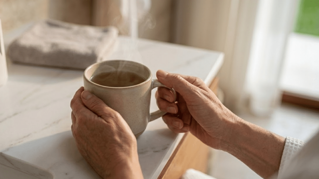 Mãos de mulher segurando uma caneca morna em um ambiente de spa doméstico, focando no conforto e na hidratação