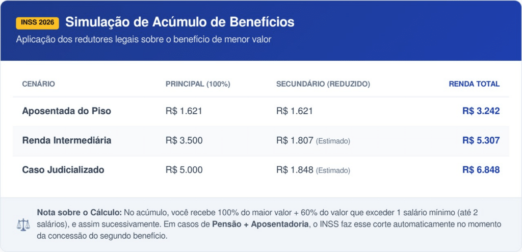 Para quem deseja acumular aposentadoria com pensão em 2026, a lógica é receber 100% do benefício mais vantajoso e uma fatia do menor. Se o segundo benefício for de até um salário mínimo, atualmente em R$ 1.621, ele é mantido integralmente, sem cortes.