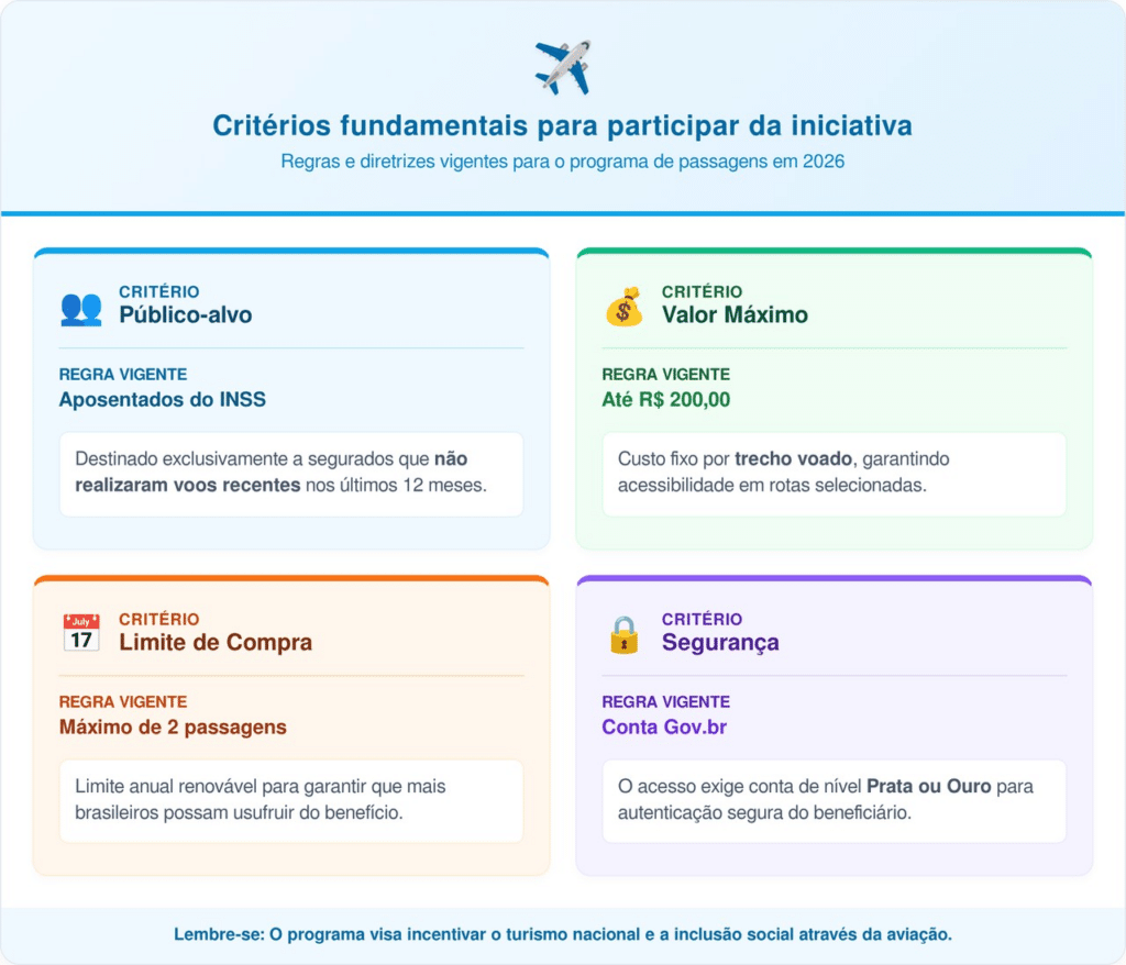A elegibilidade para o programa Voa Brasil independe da faixa de renda mensal do cidadão, priorizando apenas o histórico de consumo. O grupo principal é formado por segurados da Previdência Social que não realizaram viagens aéreas no último ano civil.