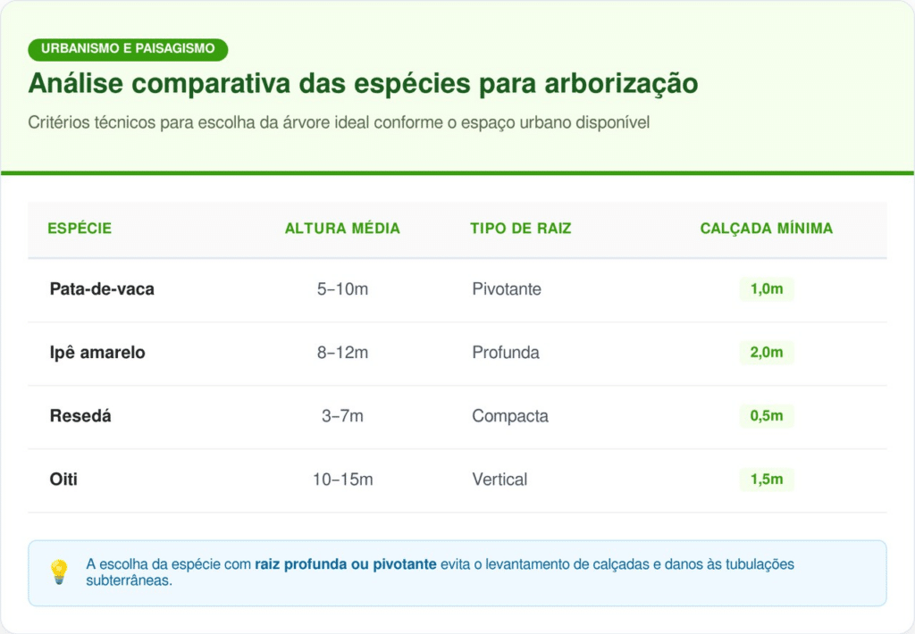 A escolha deve levar em conta a largura do passeio e a presença de redes aéreas de energia. Plantar a espécie errada sob a fiação pode obrigar a prefeitura a realizar podas drásticas que comprometem a saúde da planta. Veja o comparativo técnico entre as opções: